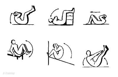 Se parte de la posición inicial: decúbito supino, con las caderas y rodillas en máxima flexión y la pelvis en retroversión; en esta posición los músculos abdominales fijan la pelvis y los flexores de las caderas están en máxima flexión.